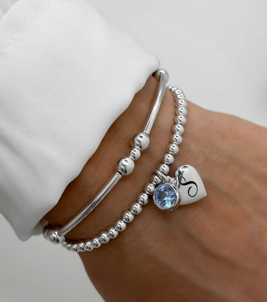 925 Sterling Silver Heart Laser Engraved Initial CZ Birthstone Bracelet