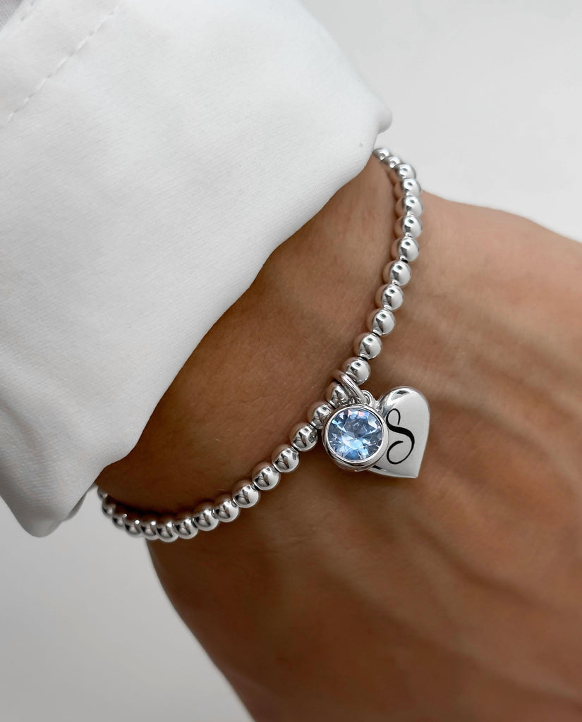 925 Sterling Silver Heart Laser Engraved Initial CZ Birthstone Bracelet, Engraved Heart Initial, Silver Bracelet, Birthstone Bracelet