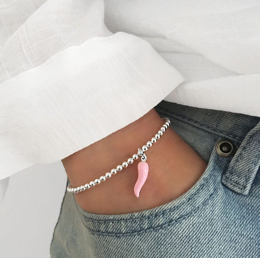 925 Sterling Silver Pink Cornetto, Italian Horn Bracelet, Malocchio Bracelet, Stacked Bracelets