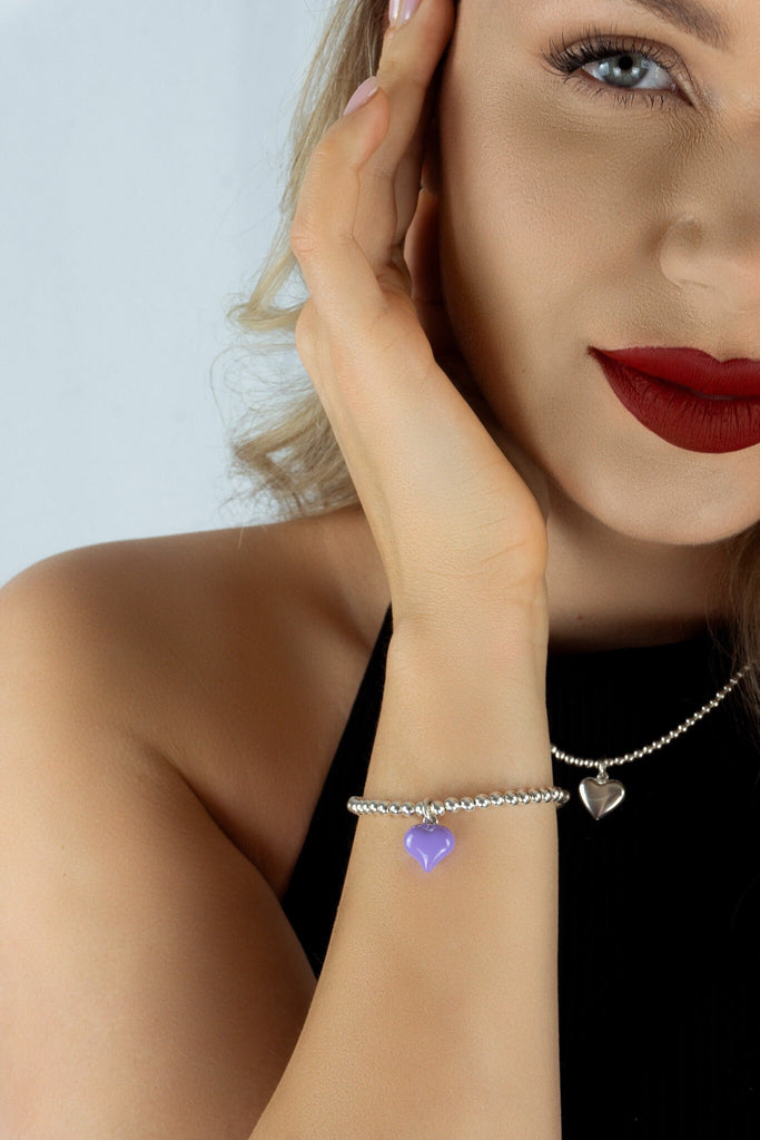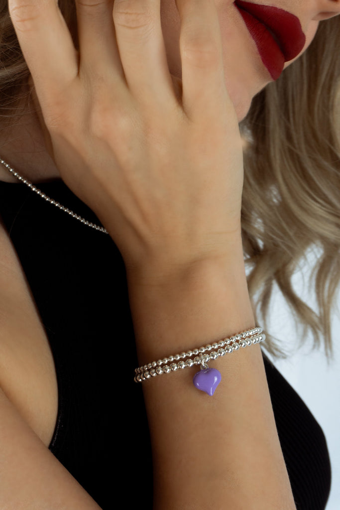 925 Sterling Silver Stretch Purple Puff Heart Charm Bracelet