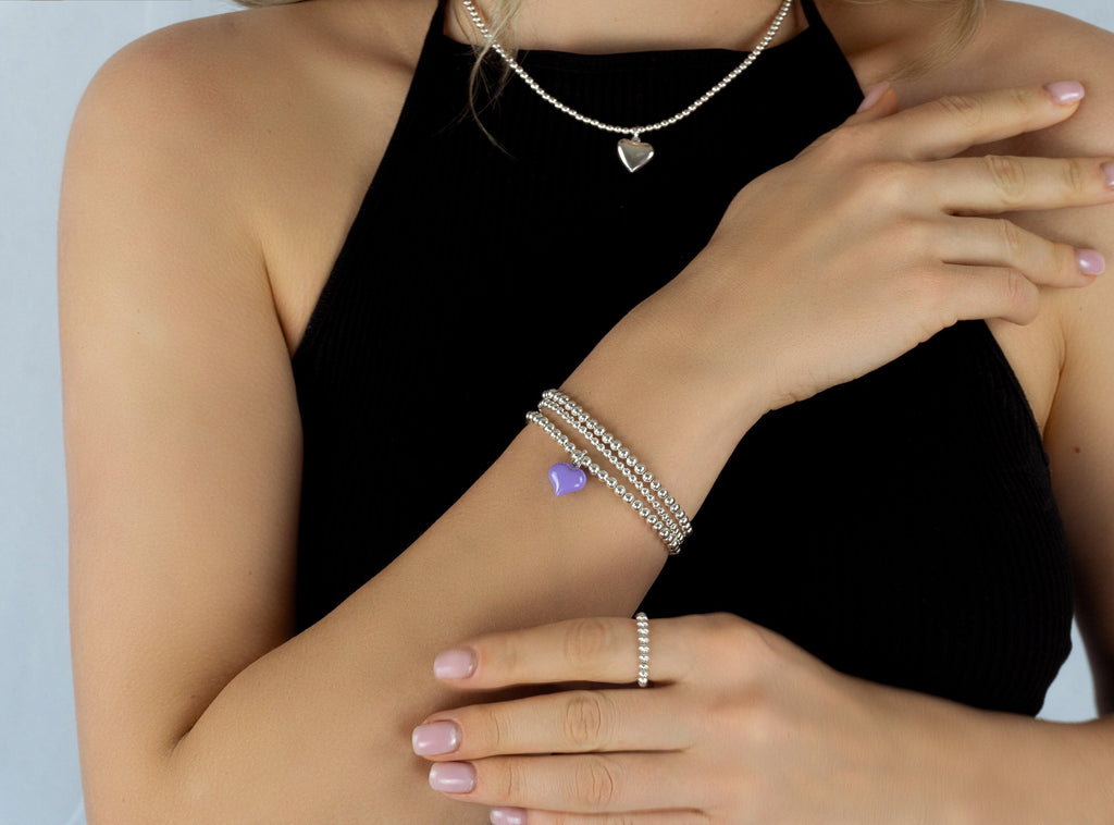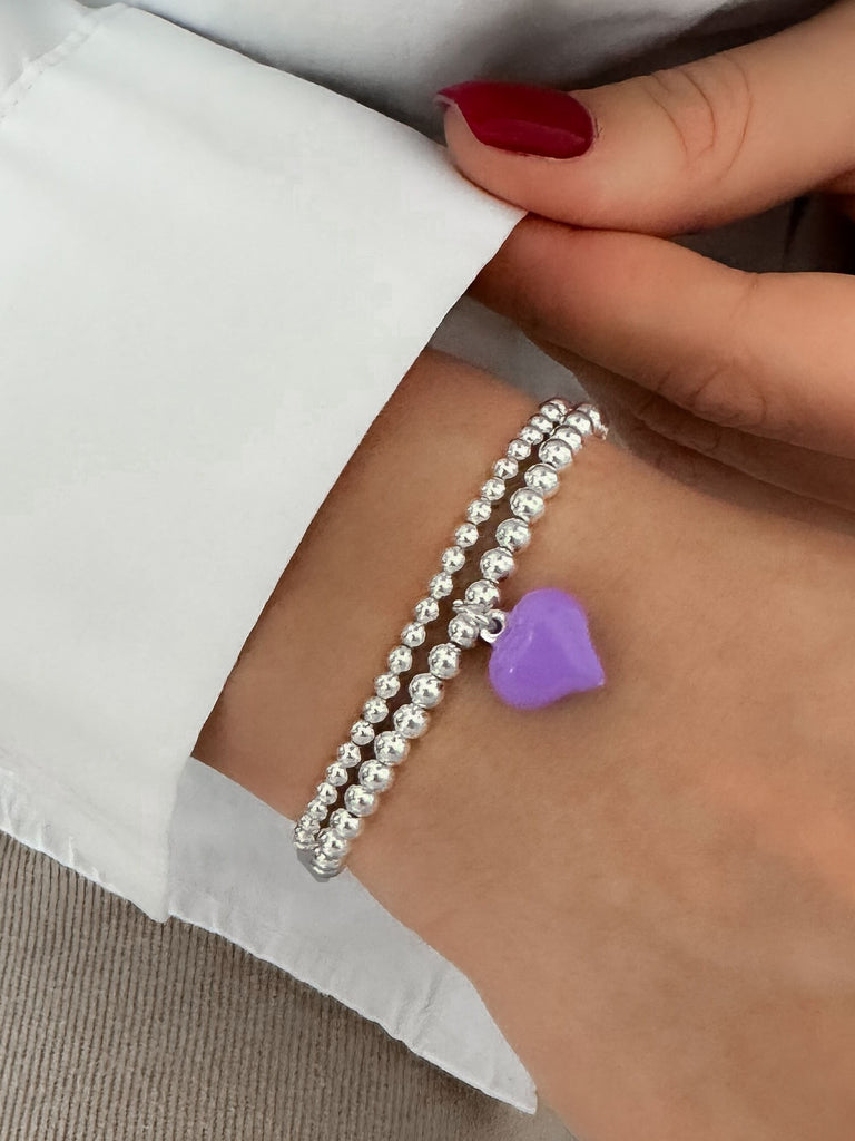 925 Sterling Silver Purple Puff Heart Charm Bracelet, Purple Heart Charm Bracelet, Heart Charm Bracelet, Stacked Bracelets