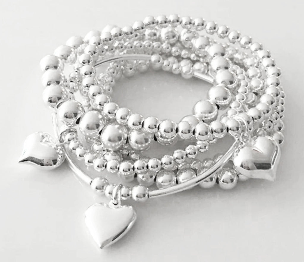 925 Sterling Silver Stretch Bracelets (Stack of 7), Sterling Silver Stacked Bracelet, Heart Bracelet