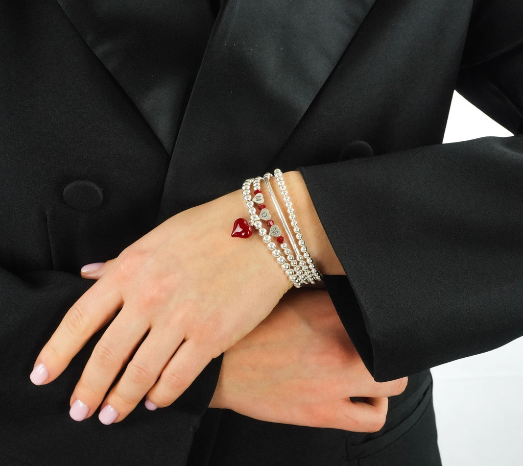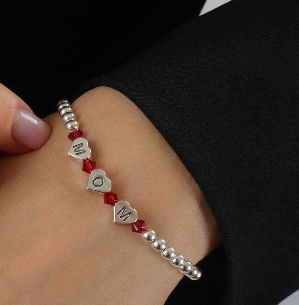 4mm Sterling Silver 3 Heart Initials Bracelet with Red Swarovski Beads